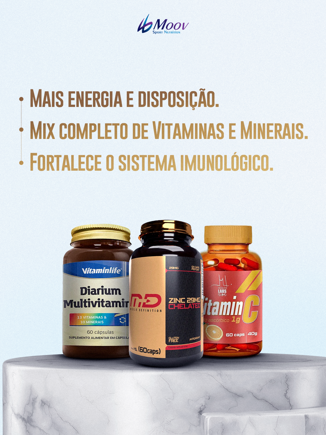 Esse combo é um suplemento alimentar completo, formulado para auxiliar na reposição diária de treze vitaminas e dez minerais essenciais ao bom funcionamento do organismo. Sua combinação equilibrada apoia o fortalecimento do sistema imunológico, promove disposição física e mental e contribui para a manutenção da saúde geral. Ideal para quem busca praticidade e eficiência no cuidado com o corpo, fornecendo os nutrientes necessários.